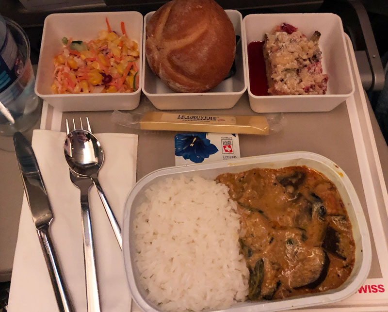 Shortly after takeoff was the dinner service, we had the choice between Chicken and Massaman Curry, we chose the curry which came with a bread roll, coleslaw salad and dessert. The curry was tasty and a great meal to have before sleeping.