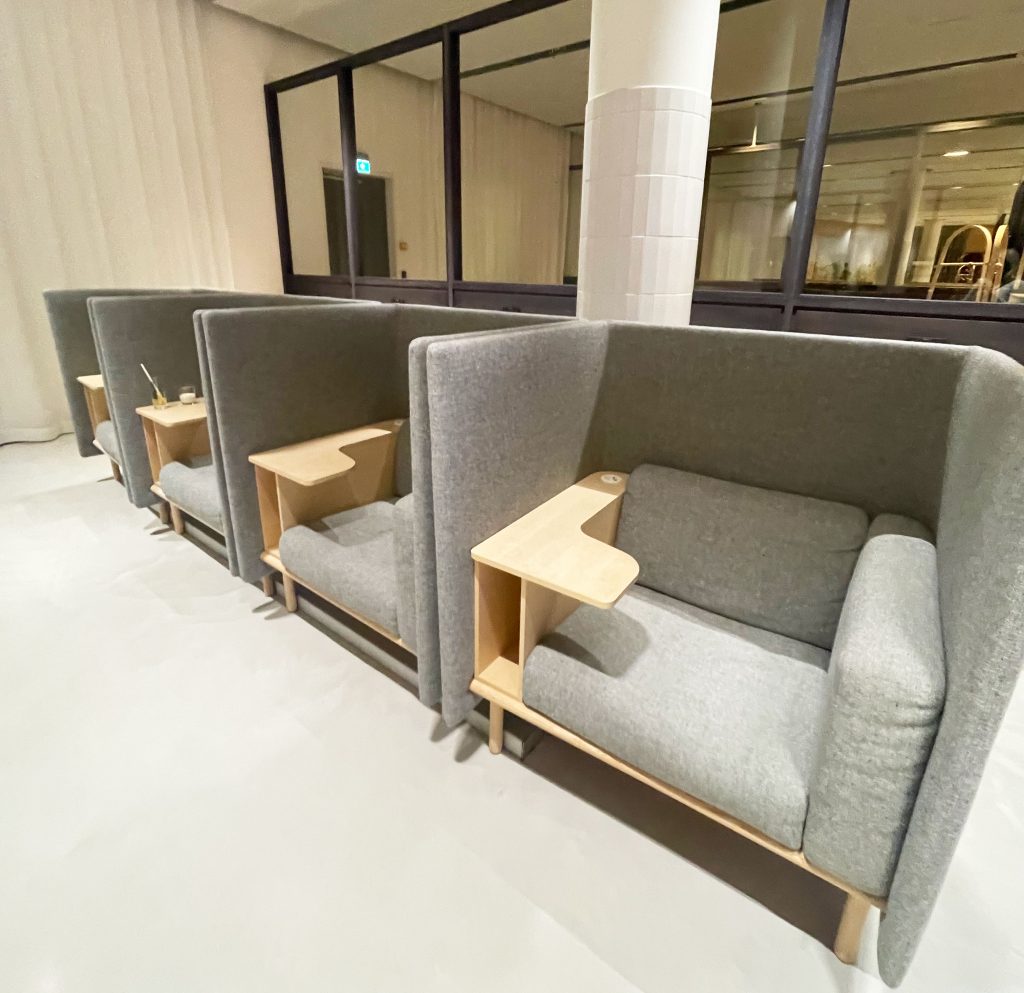 The lounge follows a very nordic aesthetic in the signature Finnair colours, making for a relaxed and clean environment. Arriving at 8pm, there were very few other passengers in the lounge. This combined with the large space made it very easy to find a private space to relax away from others. With the lounge separated into a few areas, this allowed for a good choice of seating options including cosy sofas, armchairs, private workstations, dining tables and high tables with bar stools. The majority of seats also had charging ports along with built in ports for the couches. This was a great feature as it made it easy to charge items and work.