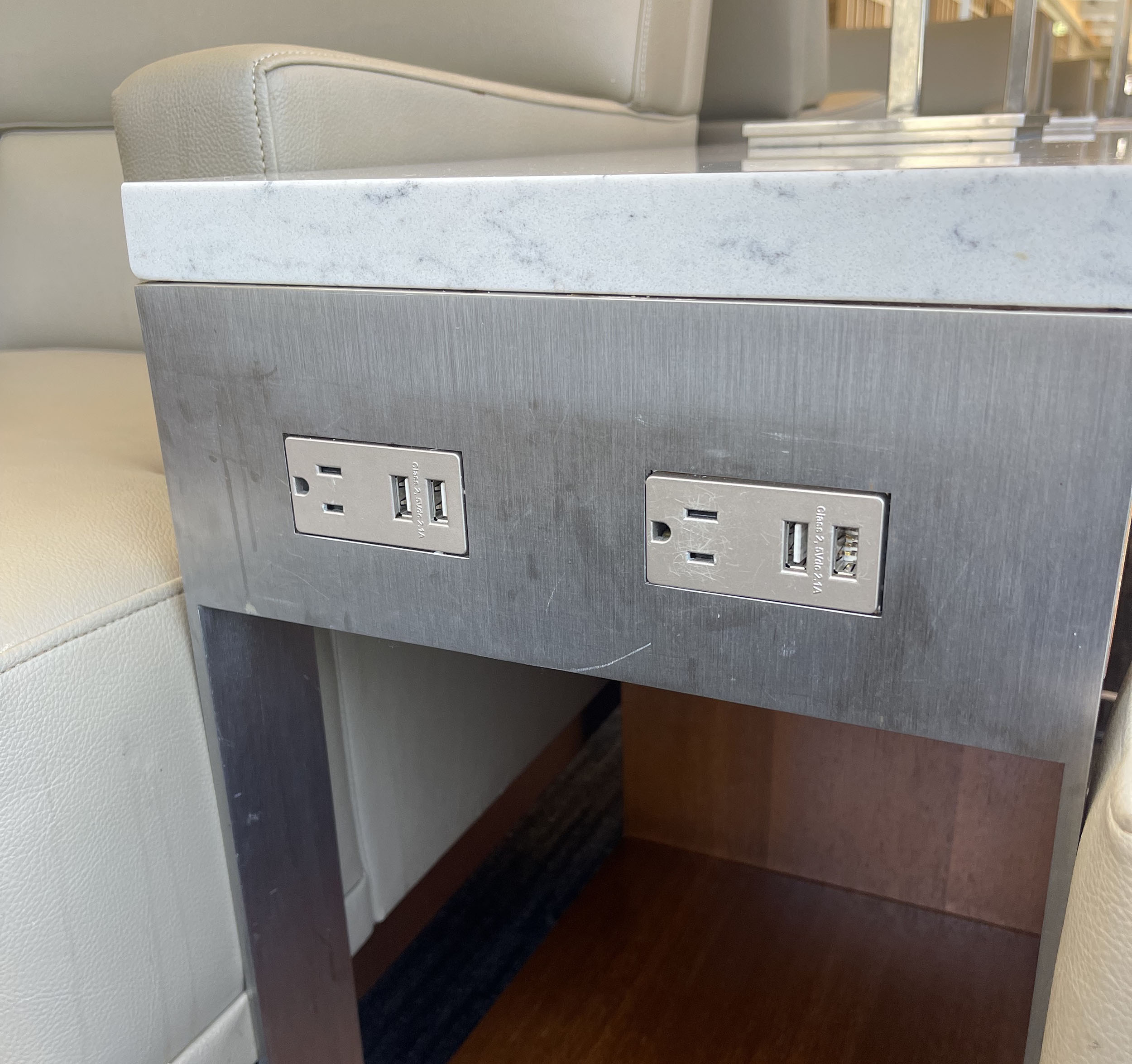 Before the lounge started to fill up as the morning progressed we were able to find a comfortable spot to sit and enjoy views over the tarmac. Charging ports were available in the tables beside the seats however the USB ports did not seem to be working when we tried charging our headphones and phone.
