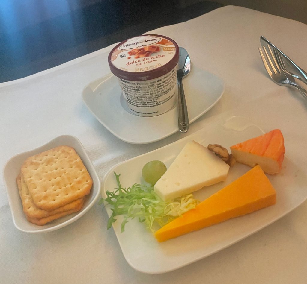 For dessert I was given both the Haagen Dazs Dulce de Leche and cheese plate of Gloucester, Manchego and Rougette cheese, garnished with walnut halves and grapes. To finish the meal, a serve of chocolate was offered.