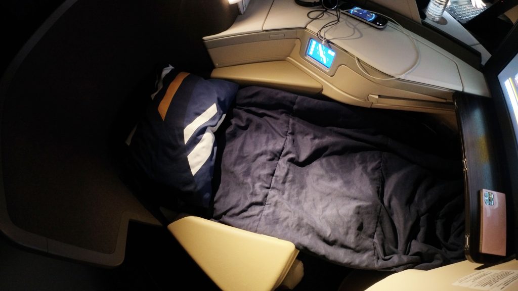 Once finished eating, I used the control panel on the side to lower the seat into a fully flat bed. The light from the control panel was nice and bright to read, however once turned off gave enough darkness for you to sleep. The bed was slightly narrow but allowed enough space for me to move through the flight.