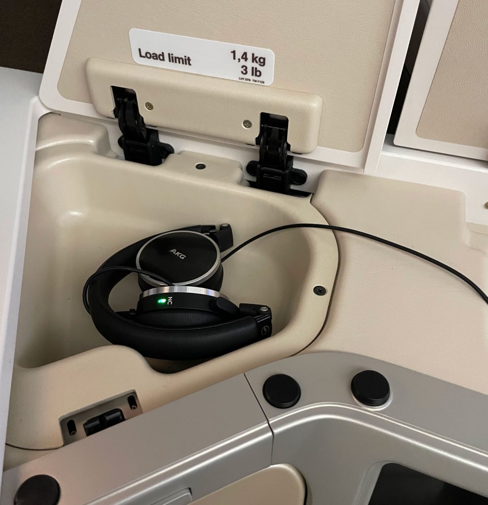 The noise cancelling headphones provided were some of the best I’ve used and made a significant difference in blocking out outside noise. The cord plugs nicely into the storage section under the bench making it very accessible but also kept it out of the way during the flight.