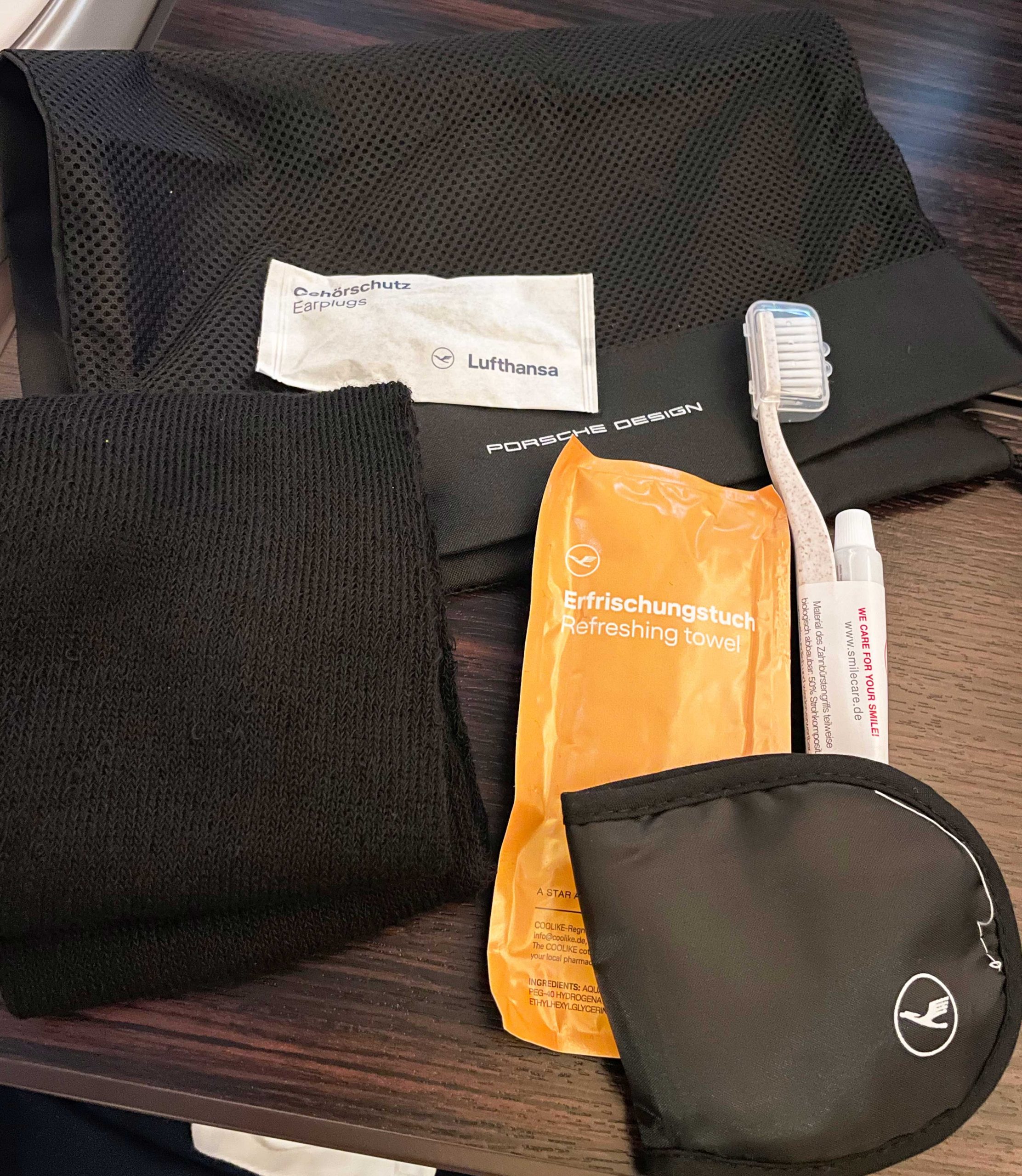 The amenity kit was provided in a neat, black mesh bag which included socks, ear plugs, a dental kit, a refreshment towel and eye mask.