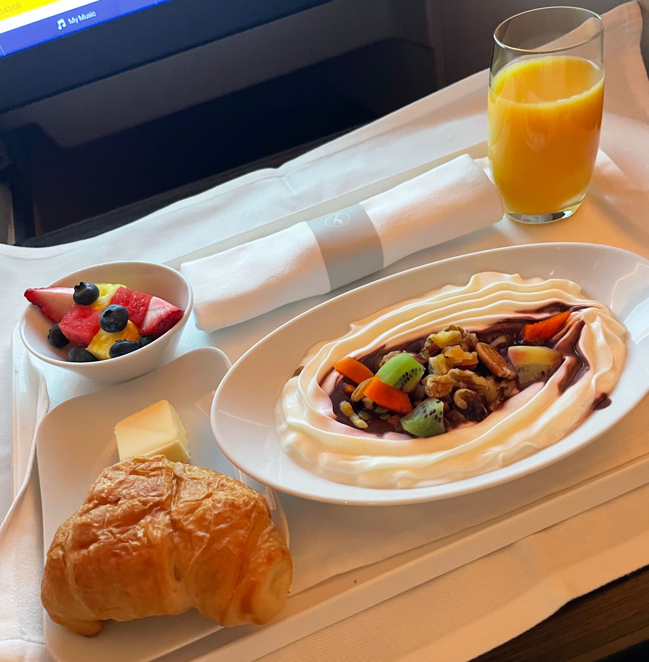 A continental breakfast was then served which included fresh fruit, yoghurt, a croissant, acai and blueberry puree, diced kiwi, dried mango and dried pear, topped with toasted nuts and seeds. This was the great quality meal and had great options to pick between.
