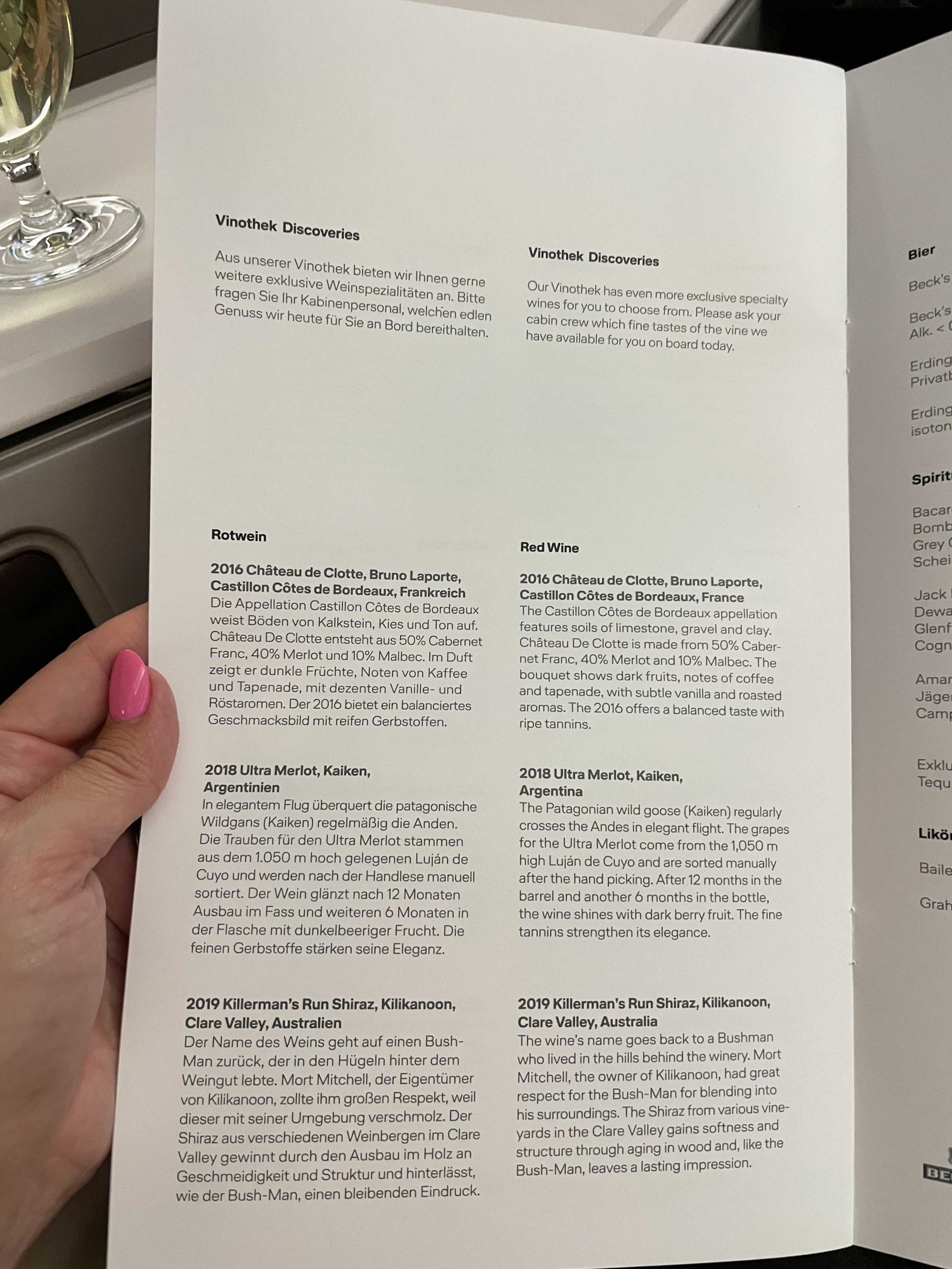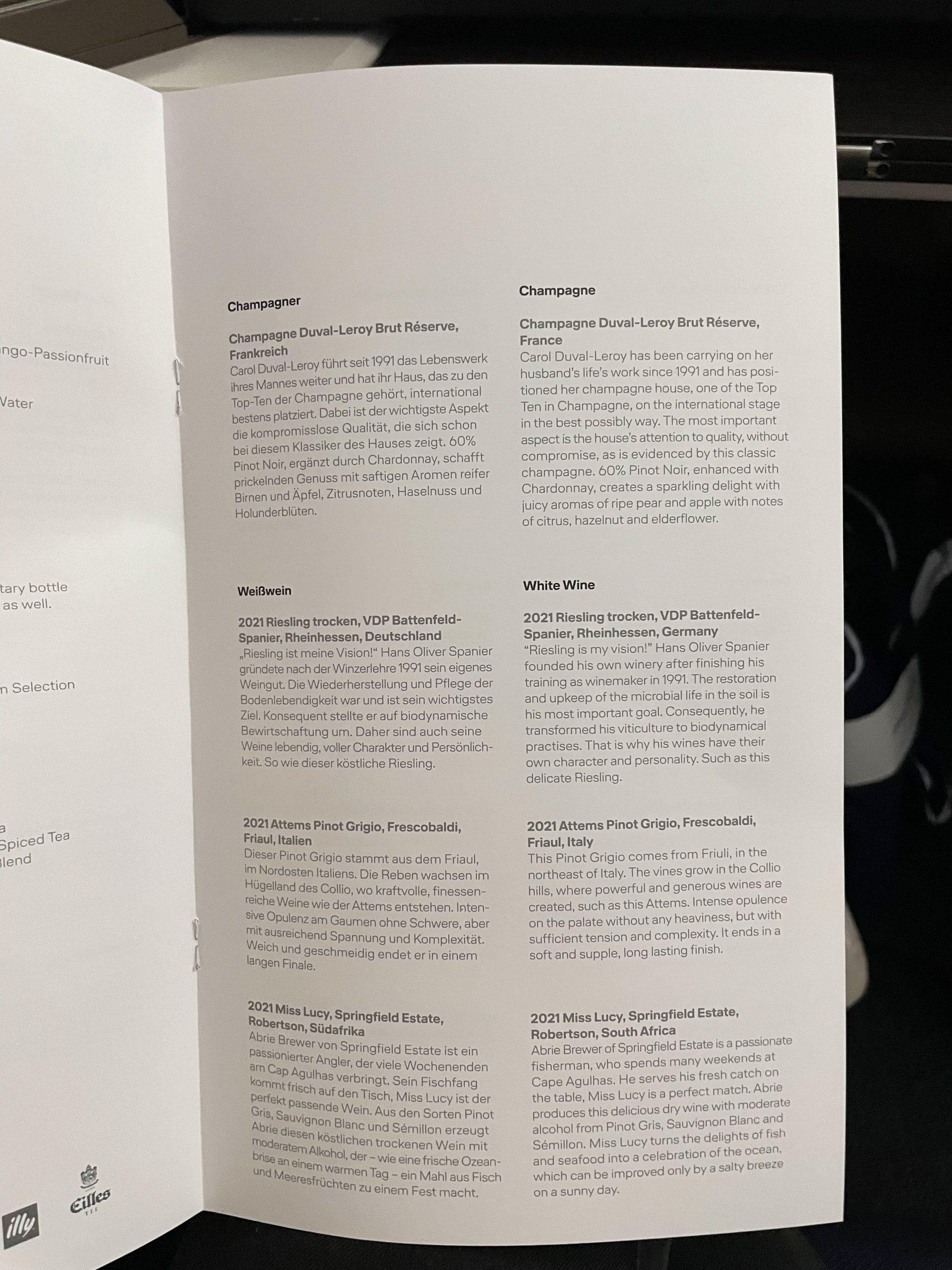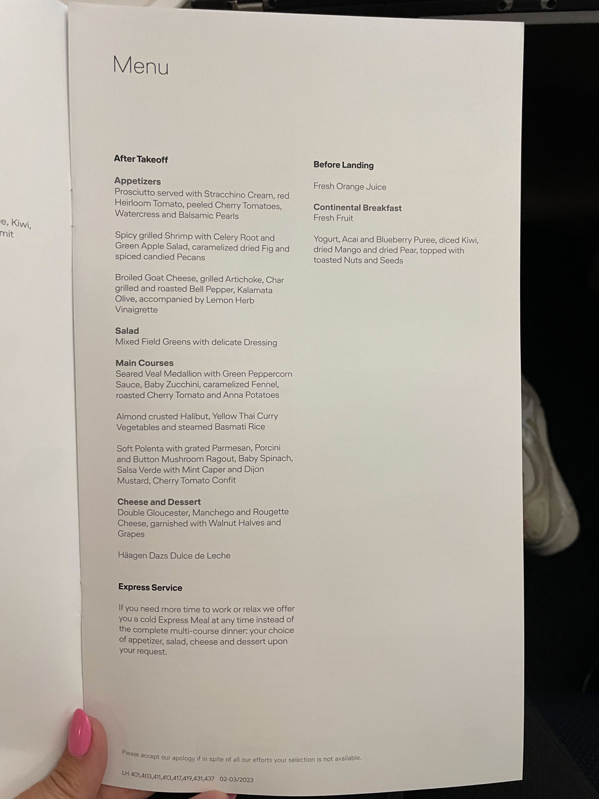 Upon arrival there was a pillow and blanket waiting on my seat along with the choice of champagne, orange juice or water. Shortly after arrival, a menu was provided in a neat booklet. You are given the option to choose from the main meals offered or an Express Service (a cold meal consisting of appetizer, salad, cheese and dessert at any time), instead of the multi-course dinner.