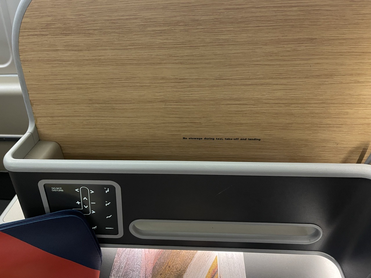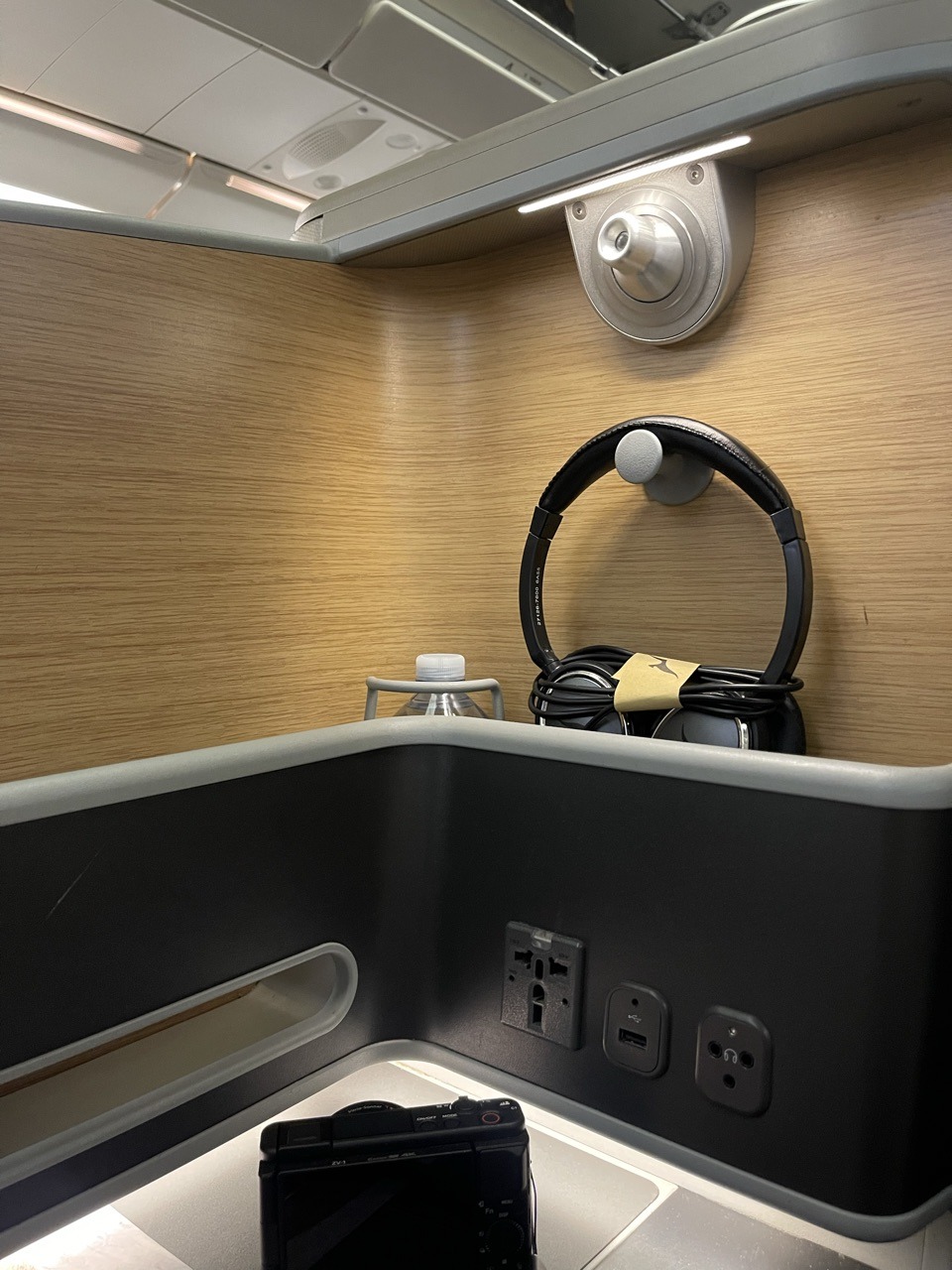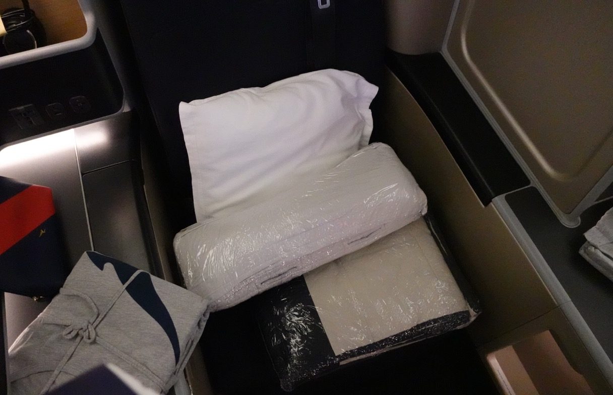 We were seated in 3A, a middle seat towards the front of the cabin. Our seat had the table located on the outside, closest to the aisle. This gave us, what felt like, a touch more privacy, compared to those that had the arm rest located on the aisle side. When we arrived at our seat, there was a amenity kit, mattress, blanket, and pillow along with a water bottle, and headphones.