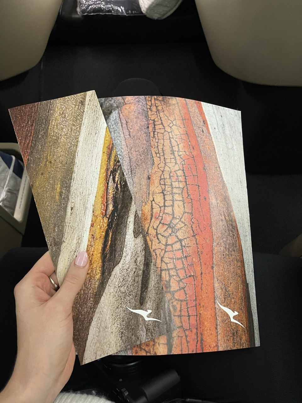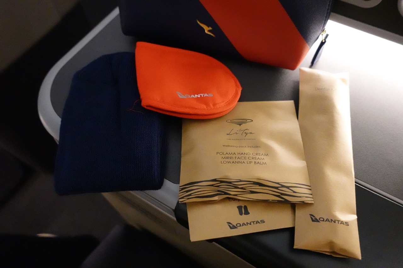 The amenity kit was in a small red and blue pouch with the Qantas logo. Inside were socks, an eye mask, Polama hand cream, Mirri face cream, Lowanna lip balm, along with ear plugs and a toothbrush and toothpaste.