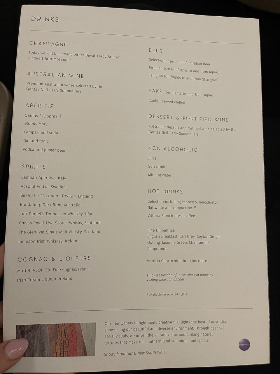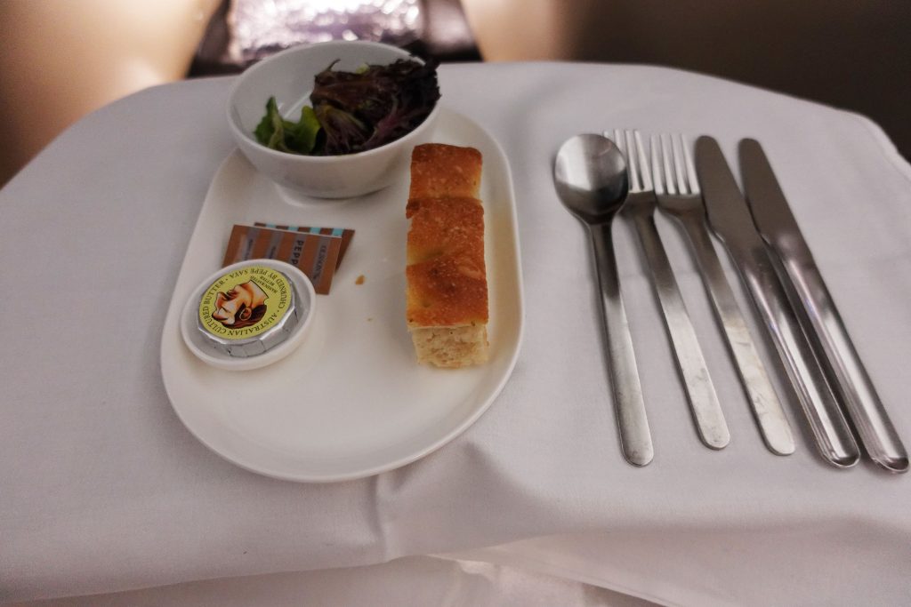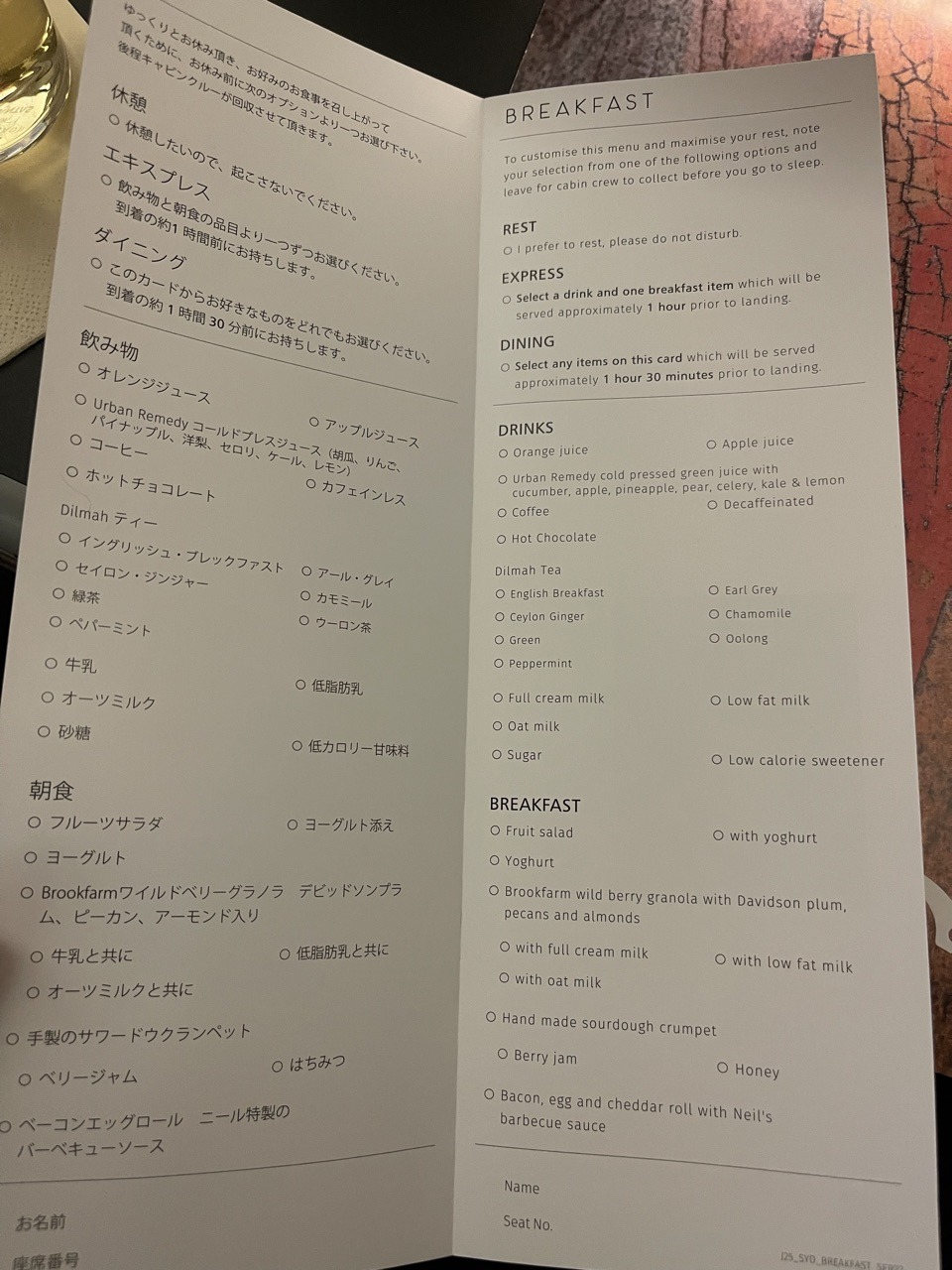 While the rest of the plane was boarding, we were offered a glass of champagne and an inflight menu that included both Dinner and Breakfast options. Shortly after take off the cabin crew came to take our orders. Due to the delayed departure, many other guests chose to skip meal service and go straight to sleep. There was also an option on the menu for an express breakfast that allows guests to sleep more before arrival, or the option not to be disturbed if they are still asleep. This is a nice touch, especially on long-haul night flights.