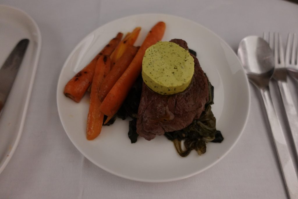 For dinner, we selected the Seared Grasslands beef fillet with thyme-roasted carrots, silverbeet and Cafe de Paris butter. The meat was tender and the butter added a rich salty flavour, this was complimented by the carrots and silverbeet. Overall it was a reasonable meal while flying.
