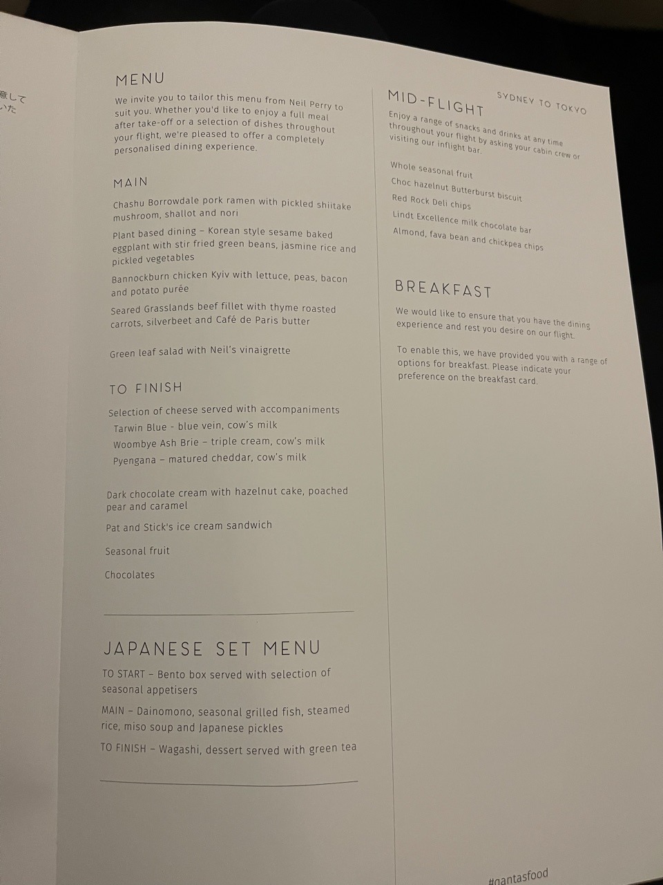 After the main dinner service, there was a selection of cheese served with accompaniments to finish including Tarwin Blue, Woombye Ash Brie and Pyengaga, along with dark chocolate cream with hazelnut cake, poached pear and caramel, Pat and Stick’s ice cream sandwich and seasonal fruits and chocolates. As it was well past midnight at this point, we opted to skip the remaining meal service and get some sleep before landing in Tokyo.
