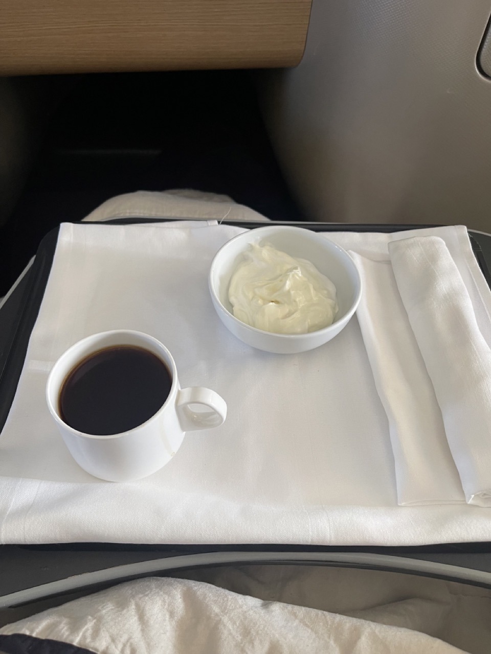 As the dinner service was served late due to departing late, we opted for the express breakfast services of a simple black coffee and yoghurt for breakfast to maximise rest before landing. Although we selected these options, we were surprised to see that the yoghurt did not come with any accompanying items such as some fruit or nuts like on other airlines. We would have liked to have some sides for this to fill out the meal more. When it came to getting a top up of coffee we had to call the cabin crew a number of times before getting served, which was slightly disappointing.