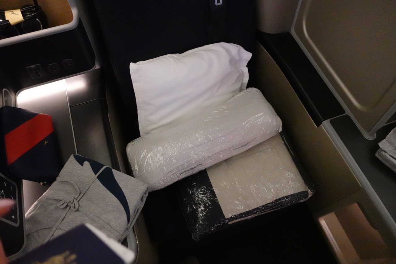 We were seated in 3A, a middle seat towards the front of the cabin. Our seat had the table located on the outside, closest to the aisle. This gave us, what felt like, a touch more privacy, compared to those that had the arm rest located on the aisle side. When we arrived at our seat, there was a amenity kit, mattress, blanket, and pillow along with a water bottle, and headphones.